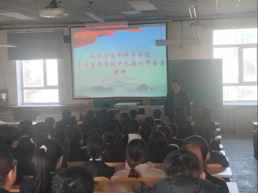 化学与生命科学学院将学习宣读党的十九届六中全会精神作为首要任务。并于12月23日南湖校区材料楼301教室和党员活动室开展学习宣读党的十九届六中全会精神主题大会。本次会议由化学与生命科学学院党委书记于洪,党委副书记徐秉锋两位老师主讲。两位老师对党的十九届六中全会精神内容进行了总结与叙述:一是通过中国共产党第三次历史决议;二是强调了两个确立;三是进一步概括了习近平新时代中国特色社会主义思想;四是十个坚持总结建党百年奋斗历史经验;五是文化建设取得重大历史性成就;六是高质量发展中推进共同富裕。此外,老师们也介绍了党的百年奋斗历程和历史经验,使同学们对党的十九届六中全会精神有了更深入的理解。