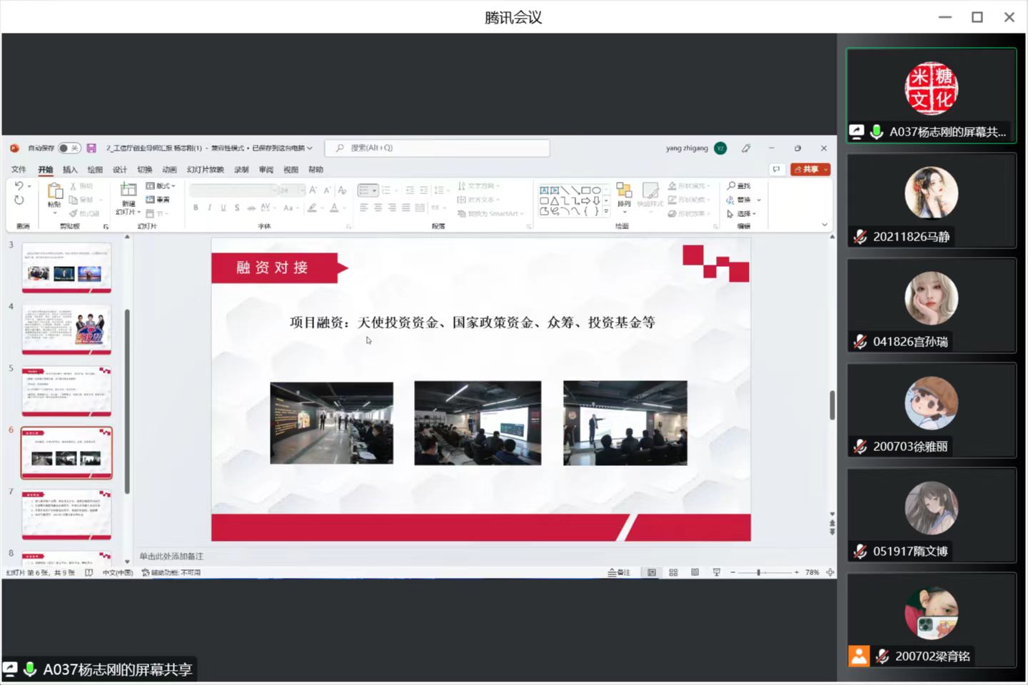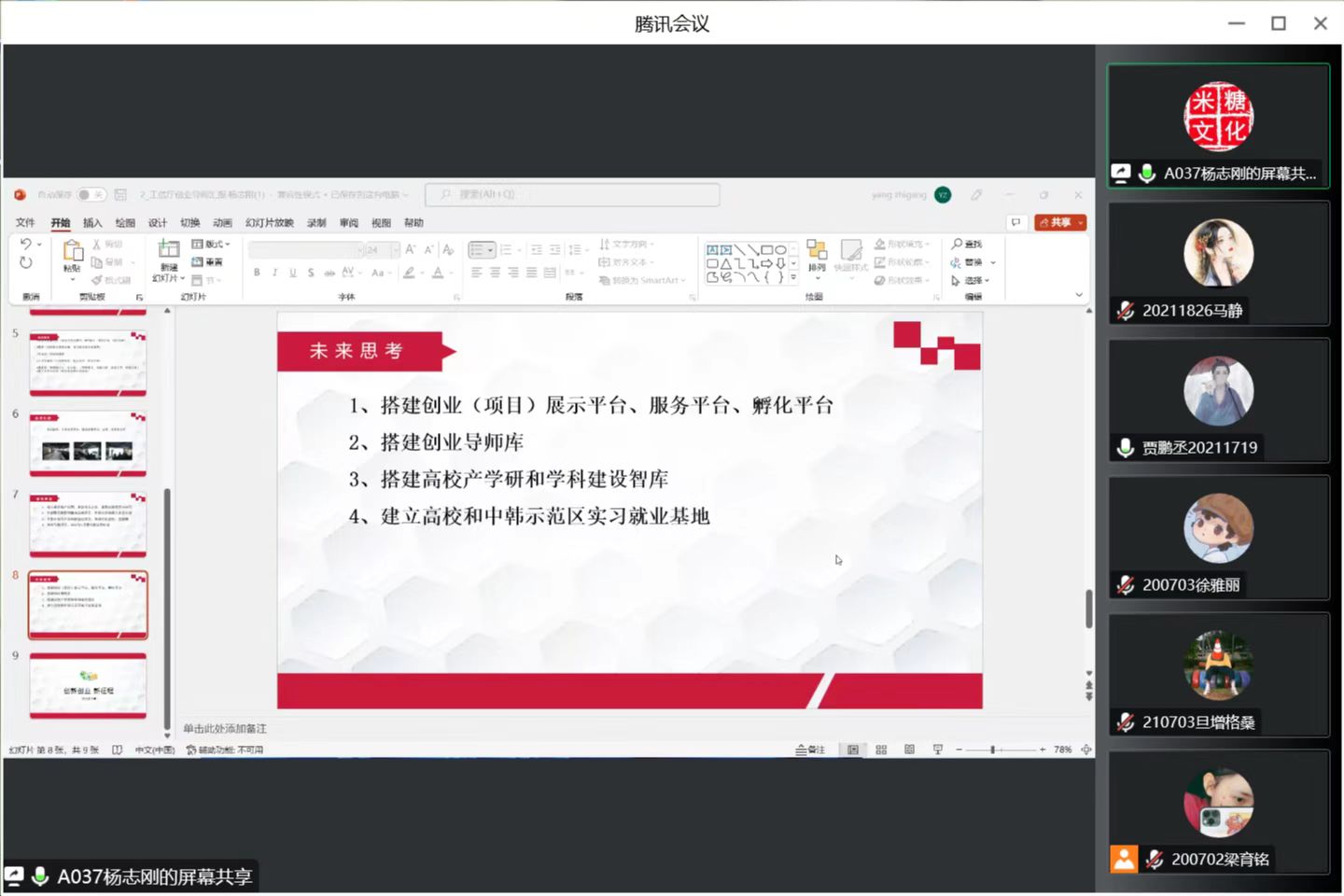 本次会议中杨志刚老师主要强调四个方面内容一是创业辅导杨志刚老师对高校进行创新创业教育的背景目的和意义进行了解读从创业就业集训营路演科技周双创周活动和人才对接会详细介绍了创新创业的方法途径二是融资对接杨志刚老师详细介绍了天使投资资金国家政策资金等项目融资为学生在创新创业过程中的资金问题提供了帮助三是辅导案例杨志刚老师介绍了靖宇蓝莓产业园等项目给学生创业带来了启迪四是未来思考杨志刚老师从搭建创业搭建创业导师库搭建高校产学研和学科建设智库等方面引发同学们对未来的思考并且建议同学们脚踏实地、勇于探索、大胆创新。为自己未来的就业做好充分的准备以便实现个人更快更好的发展