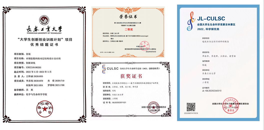深知"学问未必全在书本上",也因此十分注重培养自身实践能力以及全方位思考能力,我认为大学的学习不仅仅限于课本知识,也更应该将自己所学的理论知识转化为实践,课下我经常去老师的实验室,将自己在课堂上学习到的理论应用到实践当中。通过与师兄师姐他们的交流探讨,我对于自身的专业有了更加深刻的认识,也学会了更加科学、系统的分析问题一方面我主持了一项省级大学生创新训练项目《双层水凝胶的设计与应用》作为项目负责人,并在2023年获得优秀结题。同时,我在老师的指导下作为第二作者撰写论文A Double-Layer Hydrogel Dressing with High Mechanical Strength and Water Resistance Used for Drug Delivery》于20231月发表在《molecules》杂志(IF:4.6)另一方面我积极主动尝试学科间的相融,我通过参加全国大学生生命科学竞赛丰富了自己在生物类学科方面的经验。这些丰富的科研经历进一步提升了自己的科研学术水平,也使我领悟到学术研究的独特魅力。除此之外我多次参加各种学科竞赛,荣获生命科学竞赛国家级奖项2项、大学生创新创业项目省级一项、全国大学生化学实验创新设计大赛省级一项荣誉