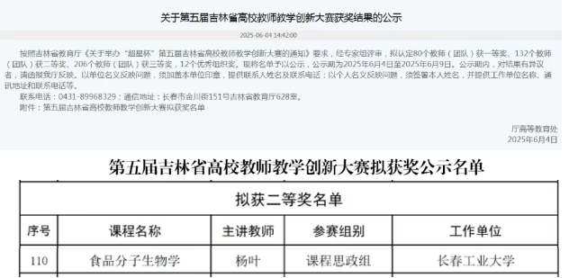近日,吉林省第五届高校教师教学创新大赛决赛落下帷幕院杨叶老师凭借《食品分子生物学》课程的创新教学实践,在课程思政组中脱颖而出,斩获省级二等奖! 这是学院在该赛事中首次晋级决赛取得的最佳成绩,实现了历史性突破
