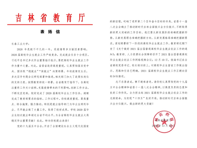 新闻网讯(通讯员 田兵)近日,学校收到吉林省教育厅表扬信,对学校征兵工作提出表扬。信中指出:2020 年征兵工作启动以来,bw必威西汉姆联官方网站认真贯彻国务院、中央军委征兵命令和省征兵工作领导小组会议精神,在省委、省政府的正确领导下,在省军区、省教育厅具体指导下,主动克服疫情带来的不利影响,将工作关口前移,创新工作方法,不断攻坚克难,超额完成了 2020 年大学生征兵工作任务。工作过程中,学校高度重视,领导靠前指挥、亲自调度,征兵工作部门加大动员力度,强化服务保障,做了大量卓有成效的工作,超额完成了年度大学生征集任务,为全省高校大学生征兵工作作出重要贡献!在此,特向你校提出表扬!