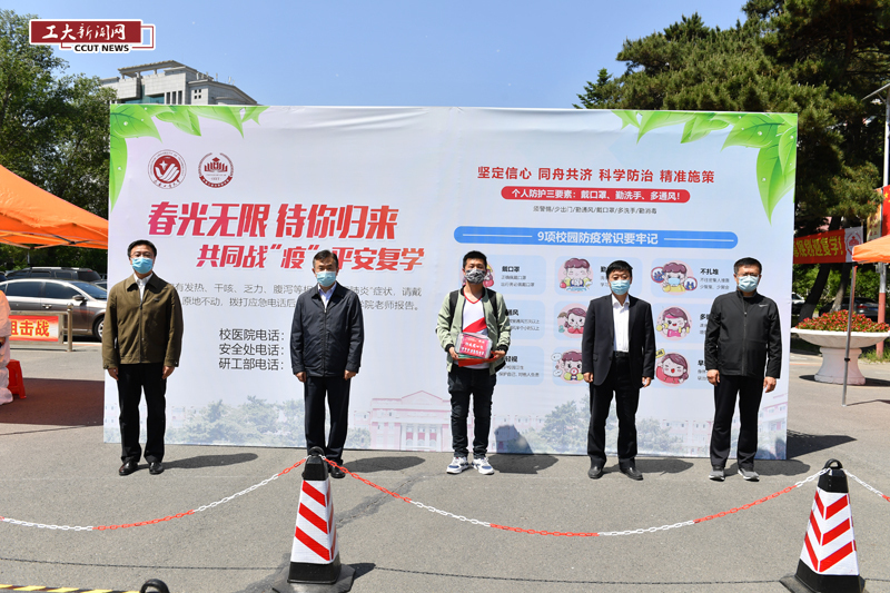 学校领导为首名返校学生赠送防疫爱心包并合影留念