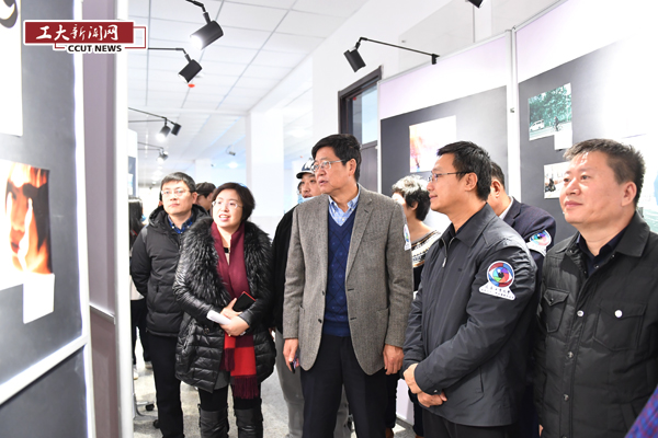 开幕式后,与会领导和师生代表在信息传播工程学院副院长吴德胜的引导下,共同鉴赏了摄影作品并合影留念。