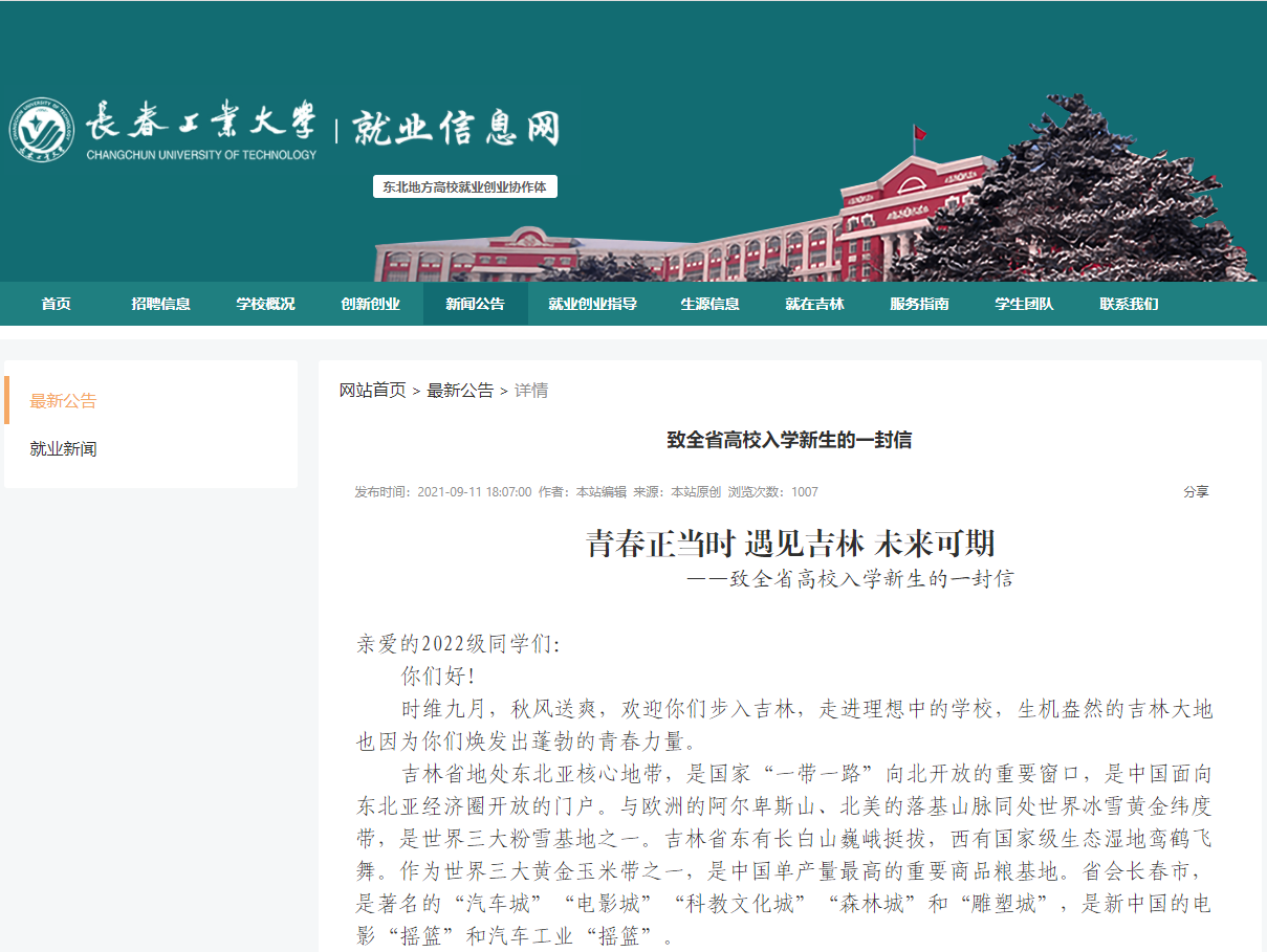 二是传达一封写给新生的信。学校通过校院两级网站、微信公众号面向全体新生和家长推送了《青春正当时 遇见吉林 未来可期—致全省高校入学新生的一封信》和《bw必威西汉姆联官方网站致全体新生家长的一封信》,以深情的笔触,表达了对同学们在吉林大地一展身手、建功立业、实现梦想,书写无悔青春的殷切期望,如暖流入心,似春风拂面,极大地激发了同学们留省就业创业的热情。大家纷纷表示,两封信的内容句句饱含深意,字字充满期望,阅读以后备感振奋,更加明晰了成长方向,在接下来的大学生活中,将珍惜宝贵年华、树立报国之志、练就实干之功,成为吉林全面振兴全方位振兴的生力军。