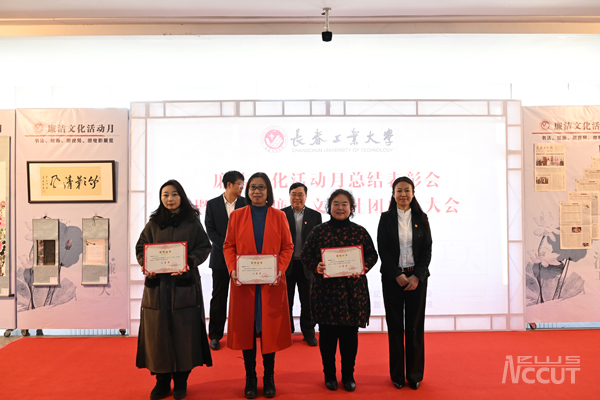 学校党委宣传部部长王亚坤宣读《关于表彰bw必威西汉姆联官方网站廉洁文化活动月书法、绘画、微视频、微电影获奖作品的决定》,学校领导李廷吉、李东玲、吴成章向获奖师生代表颁发荣誉证书。